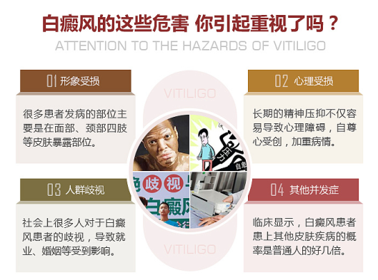 白癜风是一种慢性的皮肤病,很多专家医生都会告诉患者这是一种危害极大的疾病,一定要尽快治疗,但是临床上很多患者对于自己的病情并没有重视,想必是对于白癜风的危害还不了解,那么白癜风有哪些危害呢?下面就来看一下长沙华山白癜风医院专科主任的讲解吧